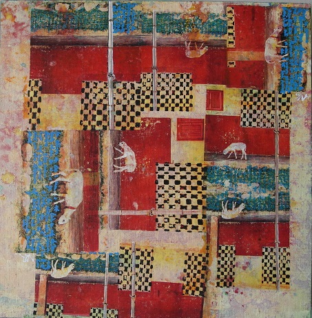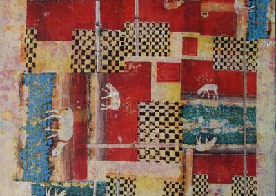 Bois, terre cuite, pâte à réparer, acrylique, vernis