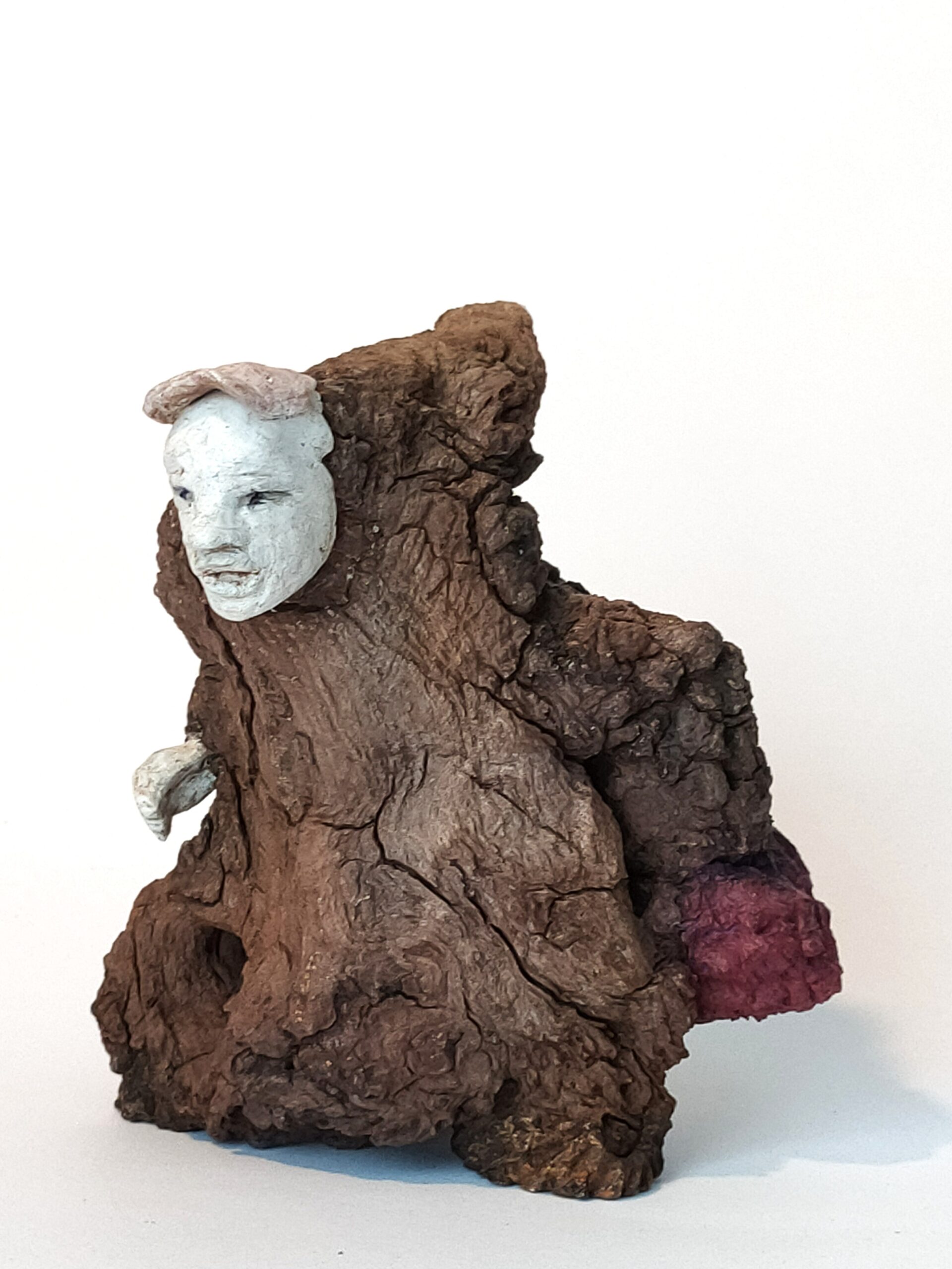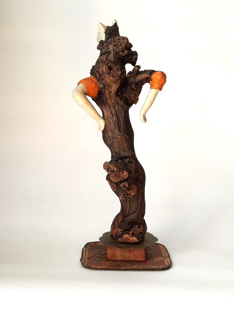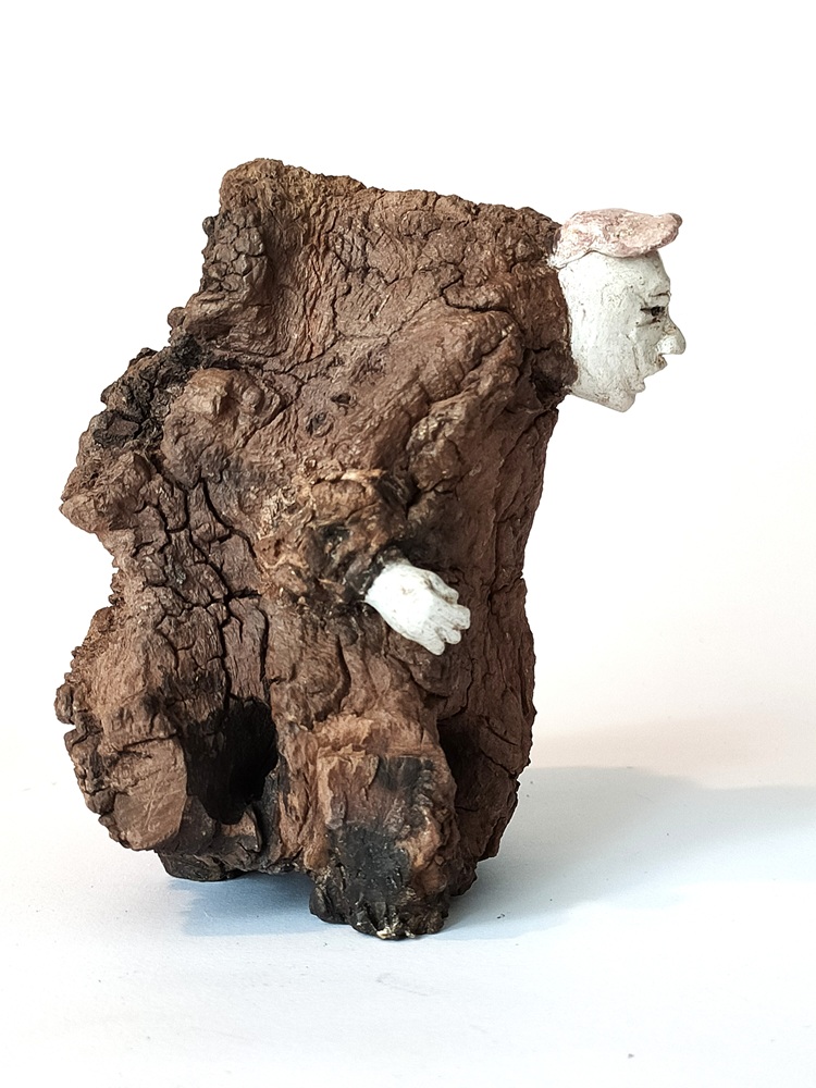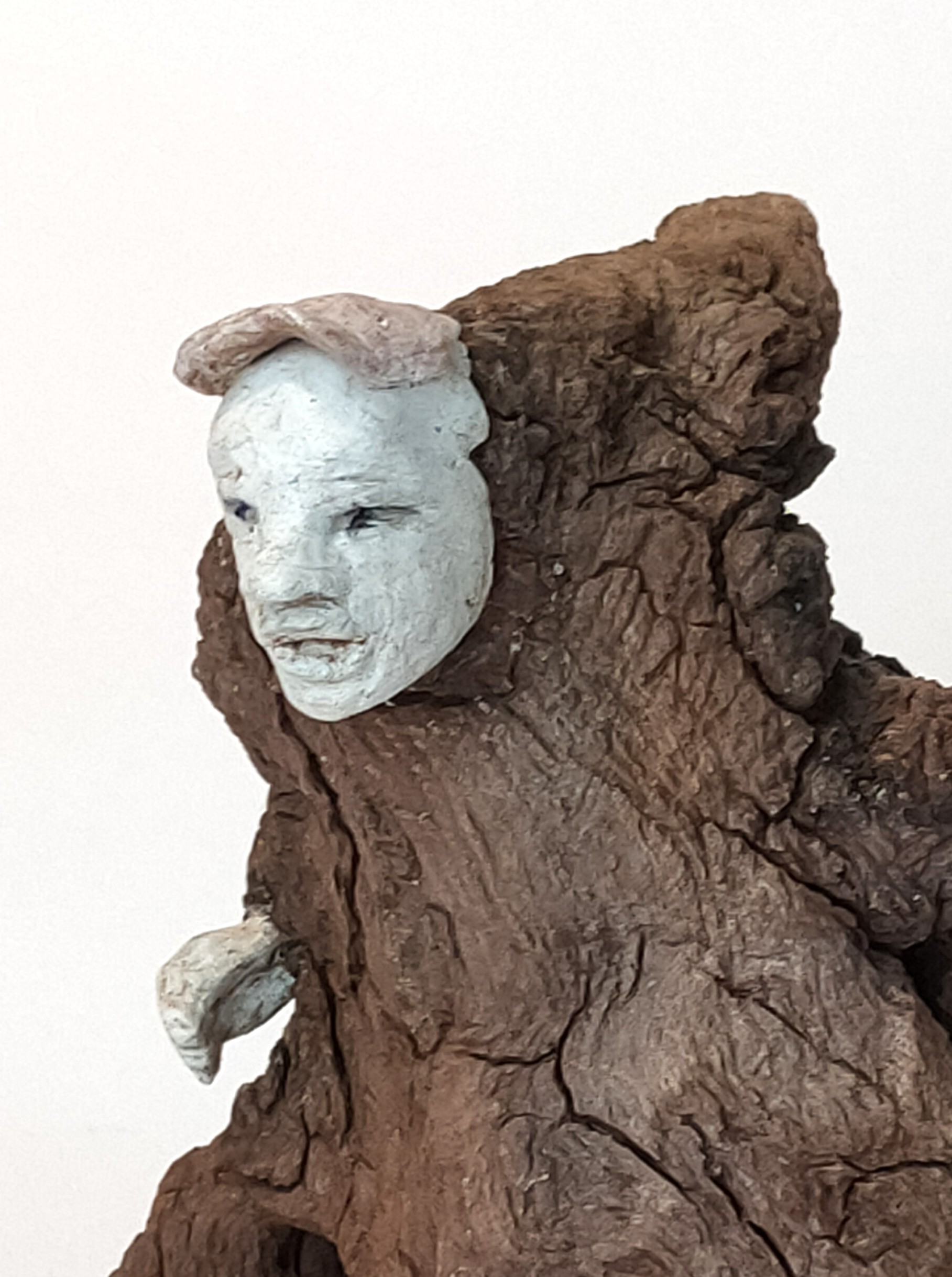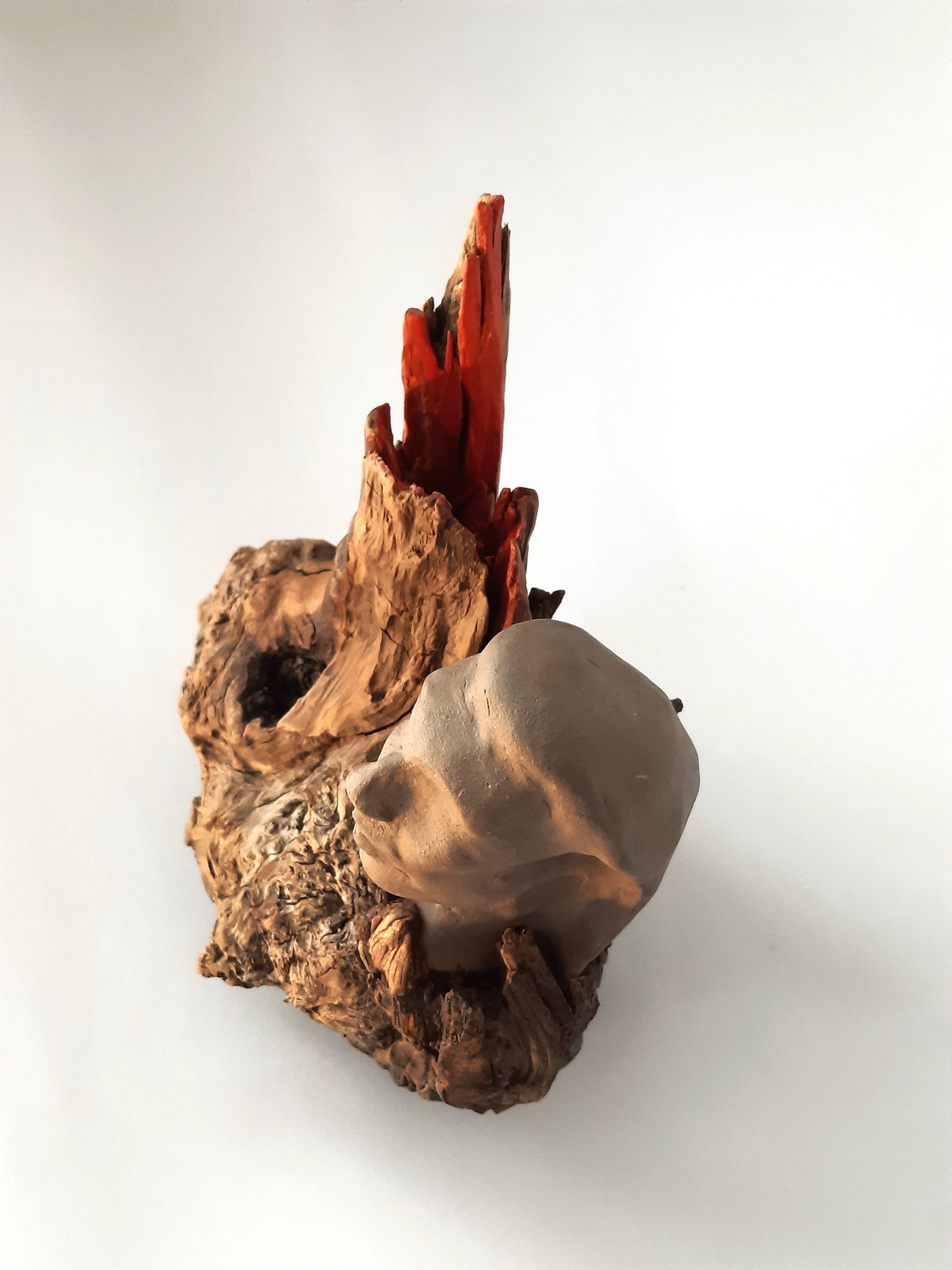 Bois sec, terre sans cuisson, pâte à réparer, acrylique, vernis.