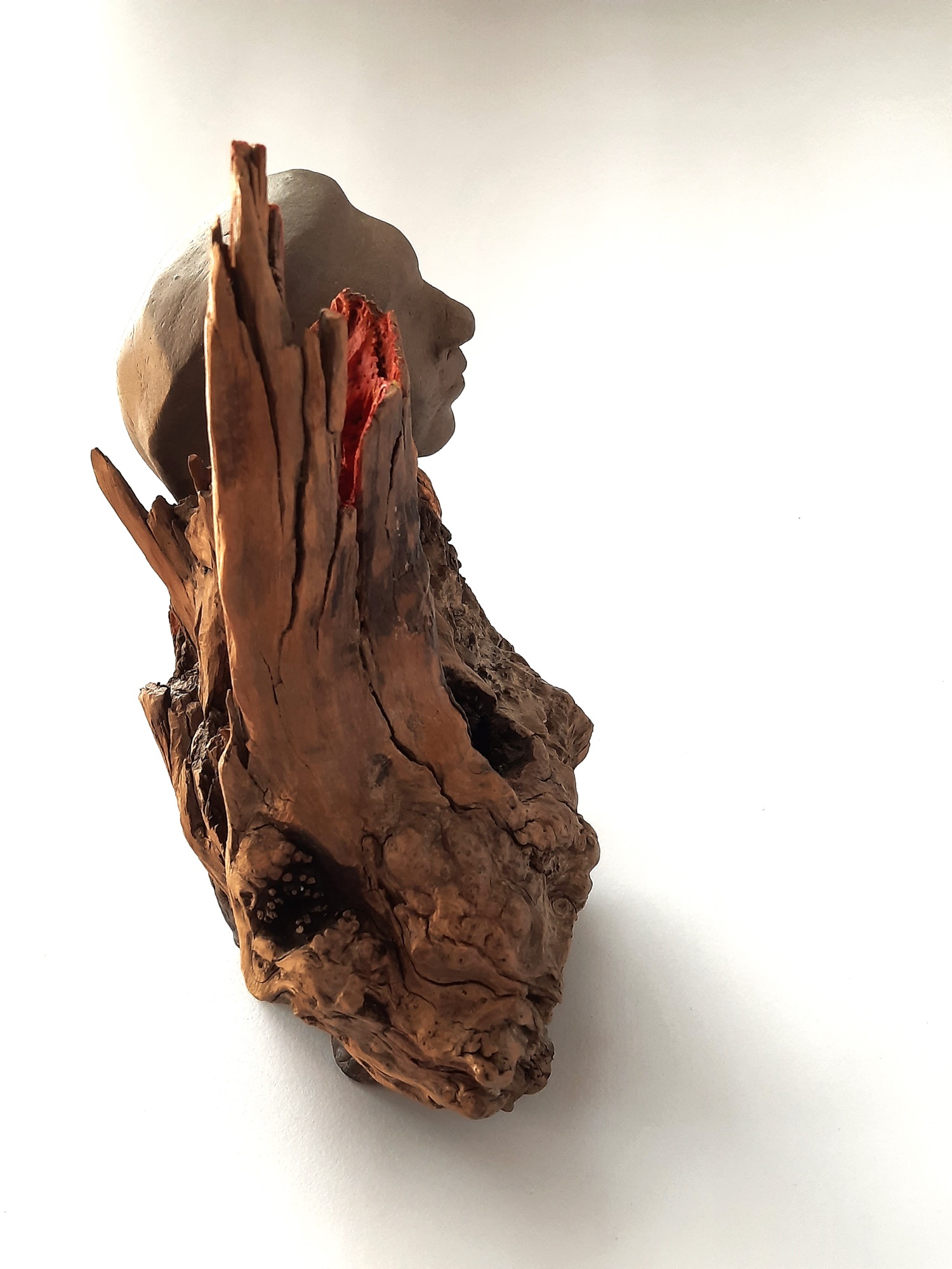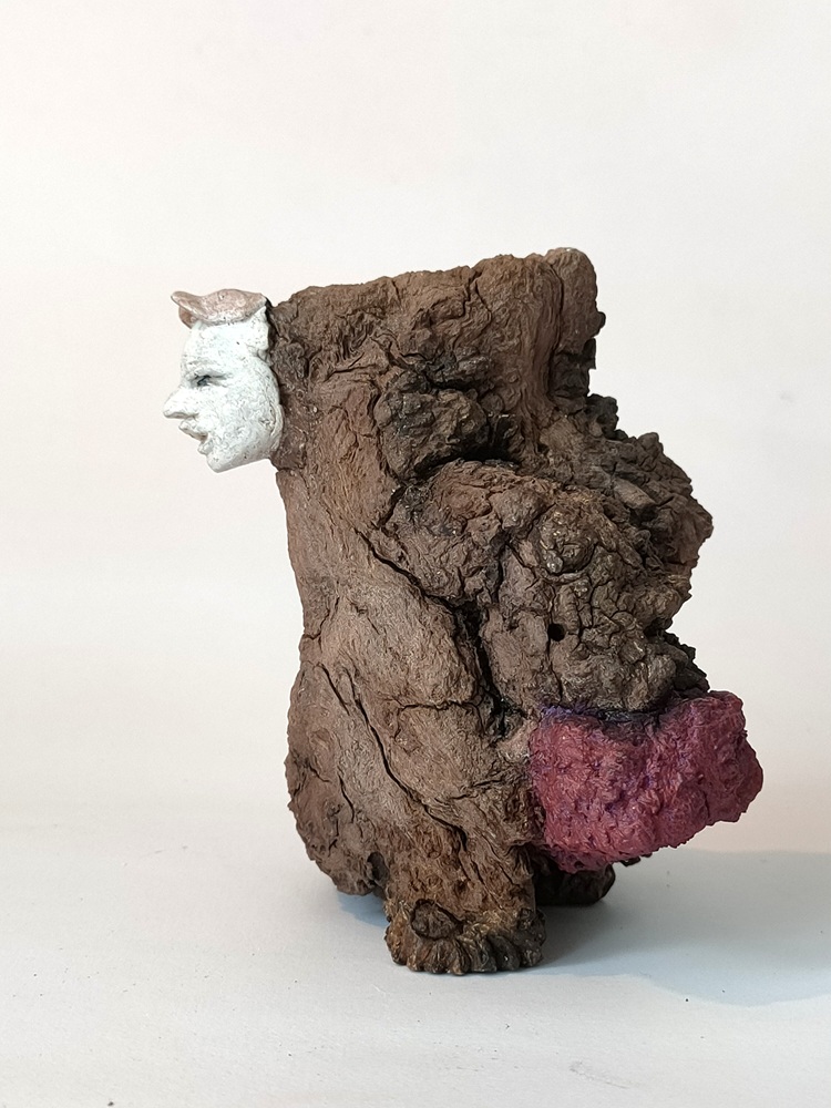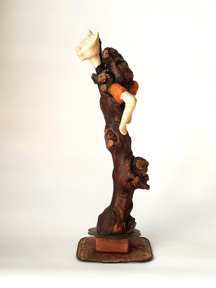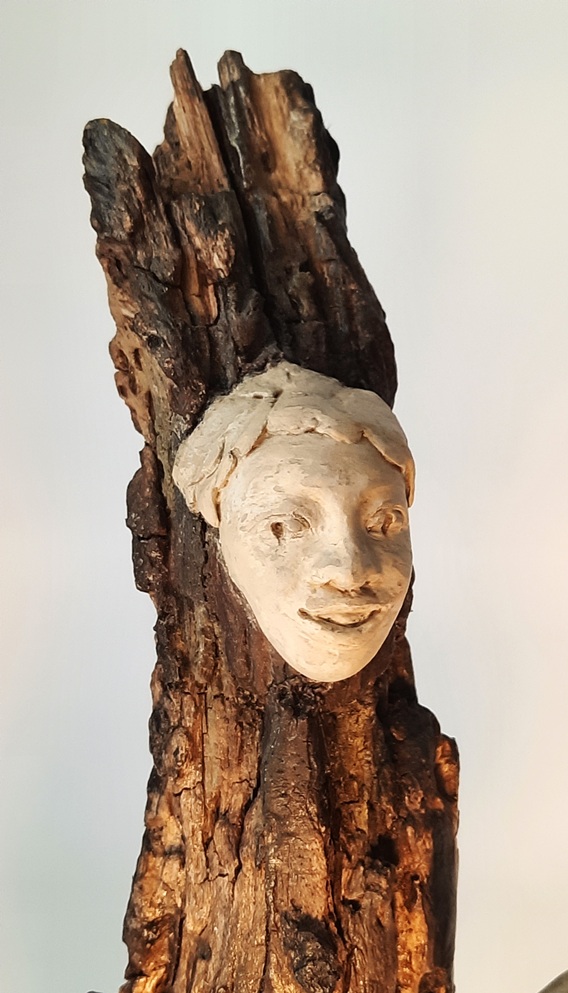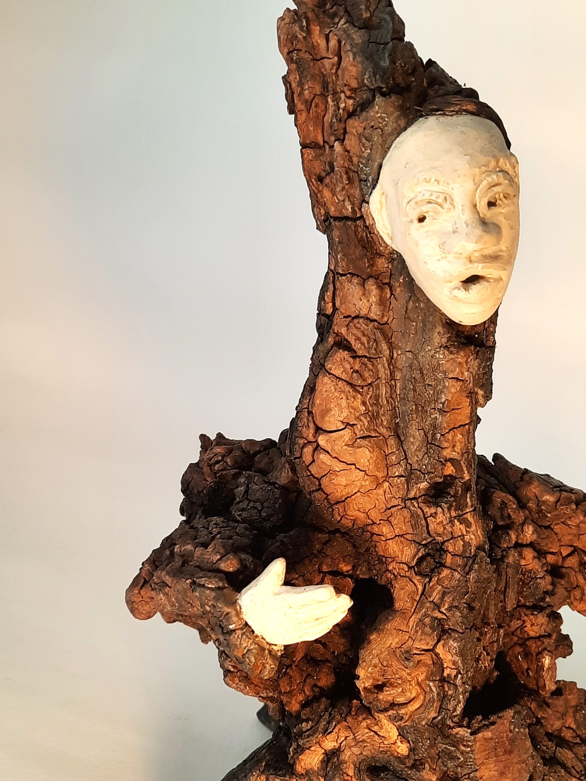 Bois sec, terre sans cuisson, pâte à réparer, acrylique, vernis.