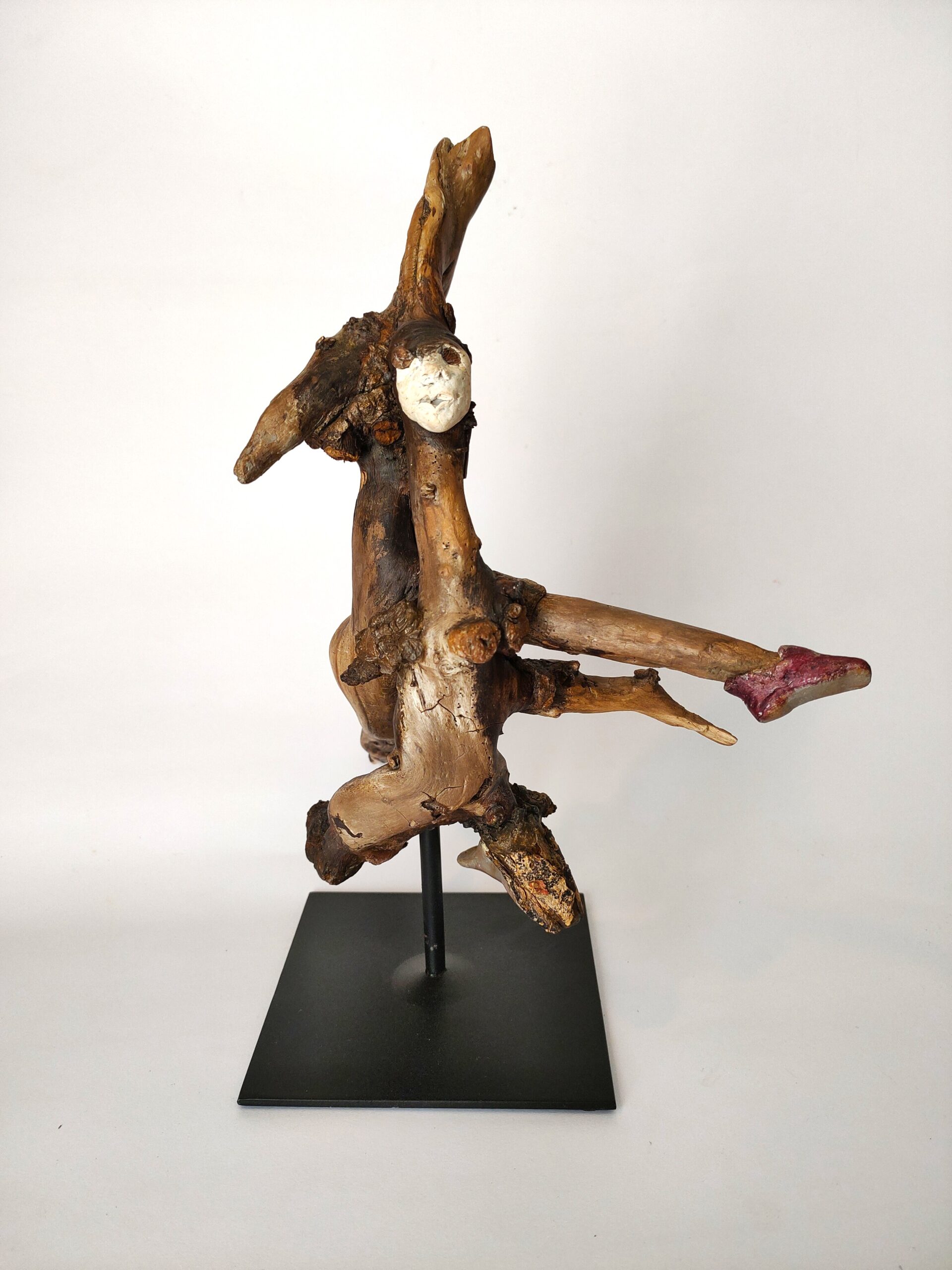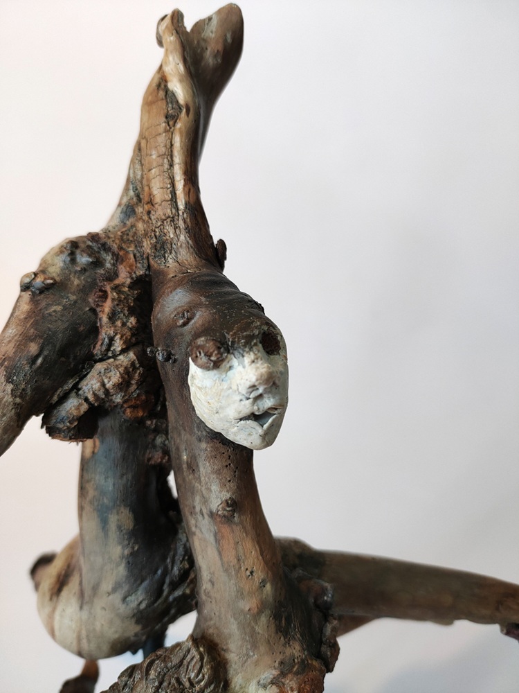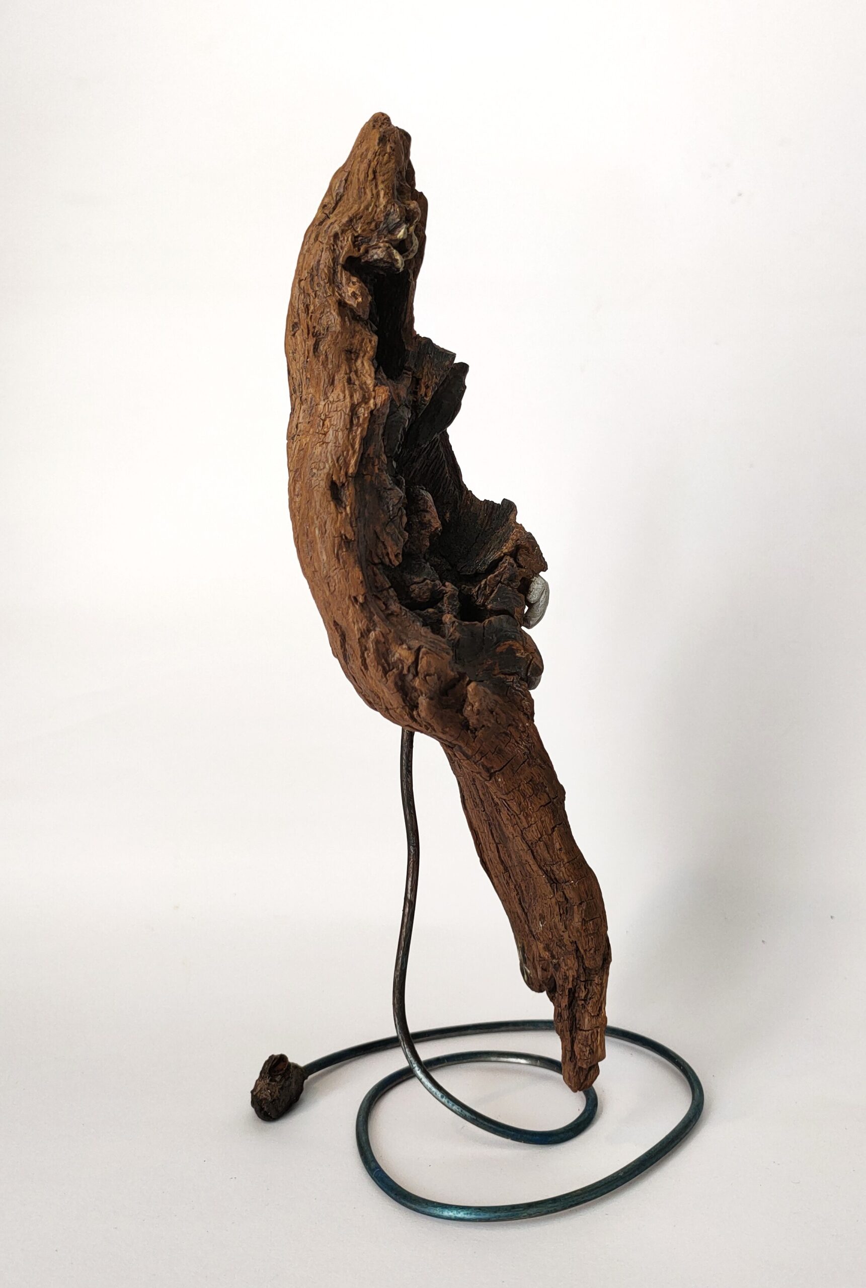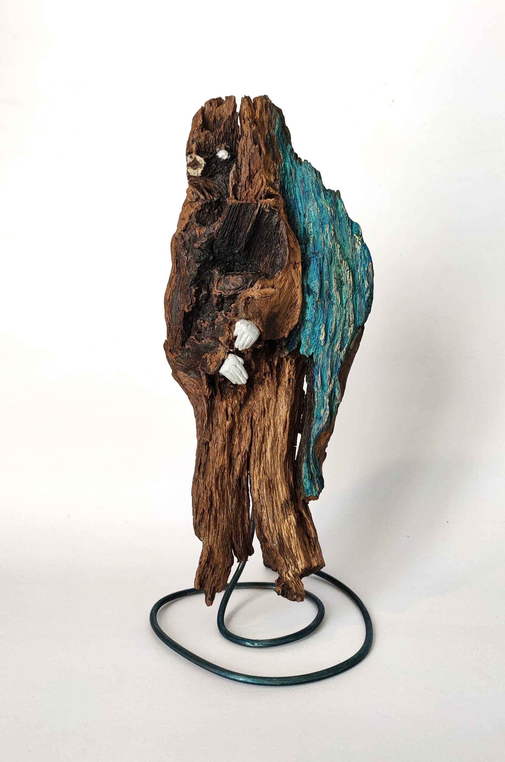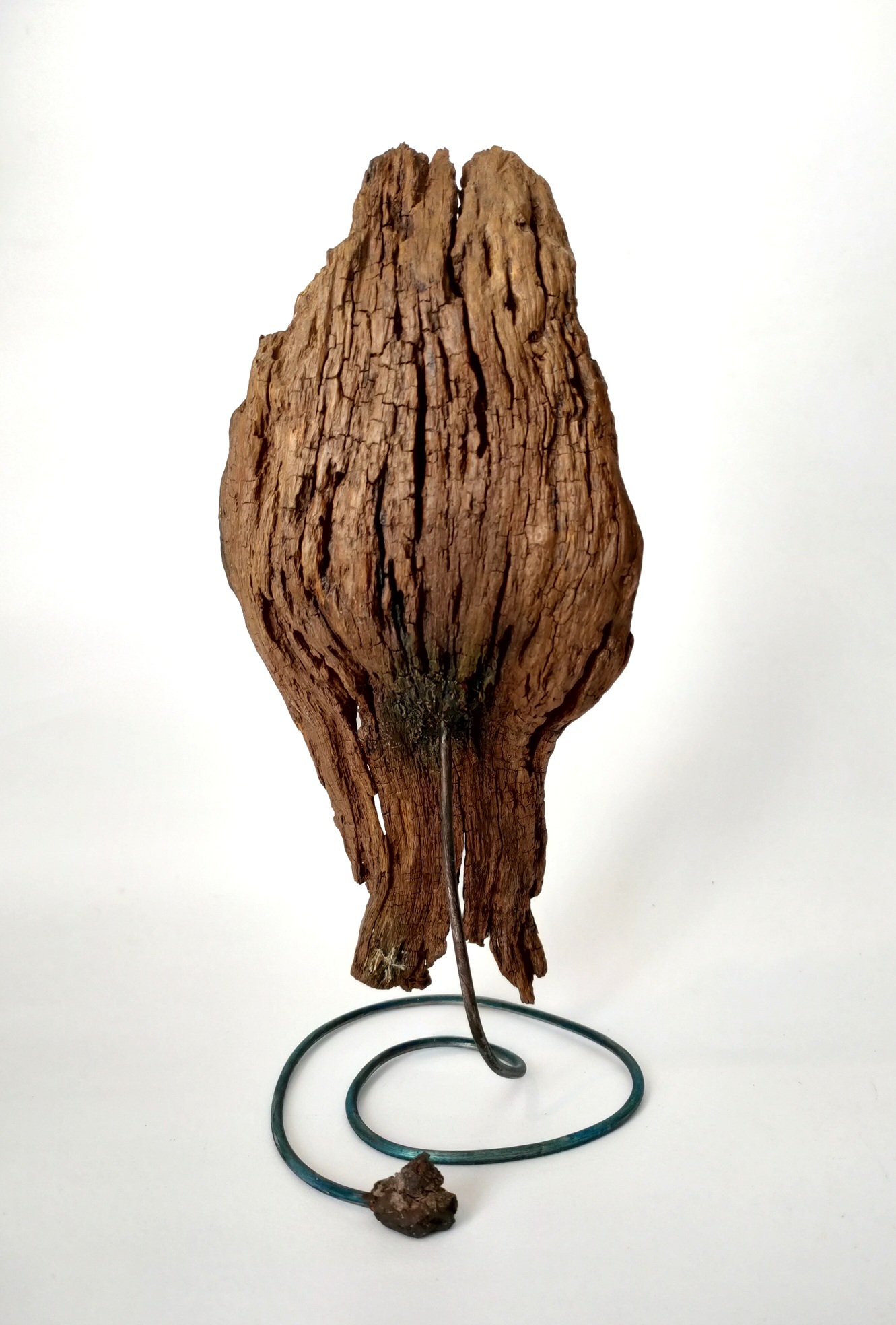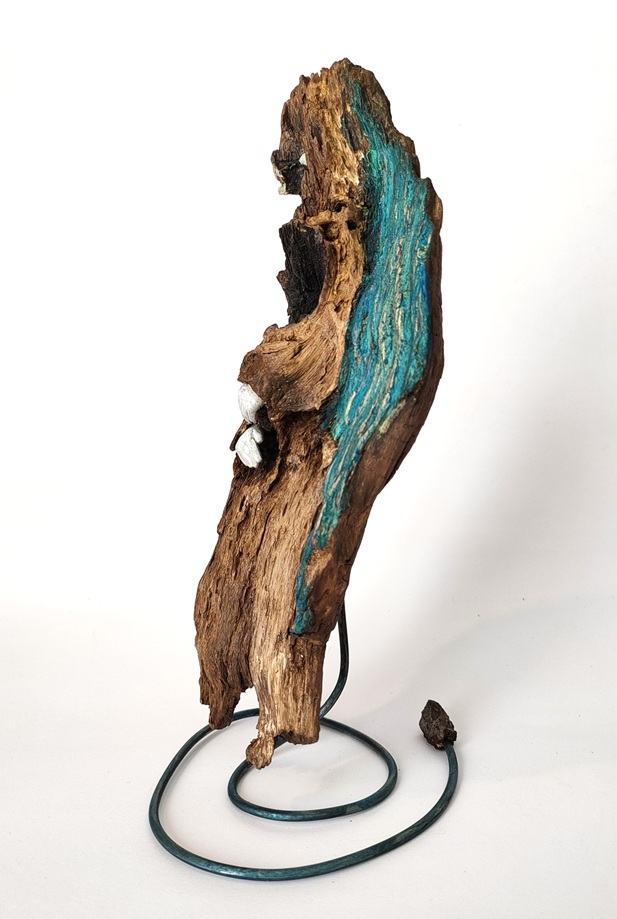 Bois flotté, métal, pâte à réparer, acrylique, vernis, socle fil de fer.