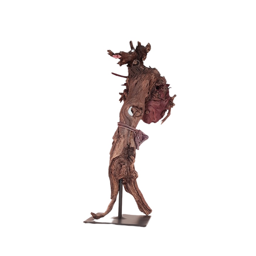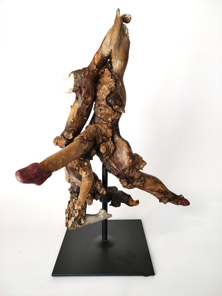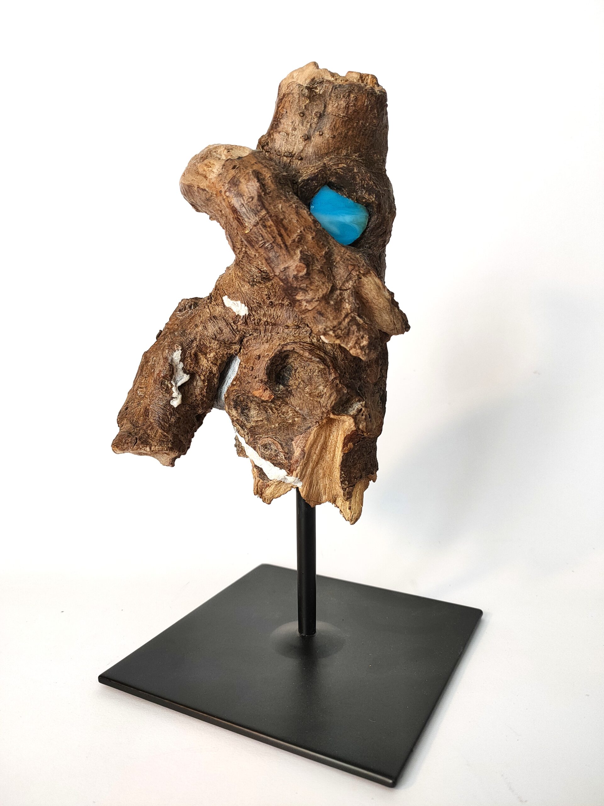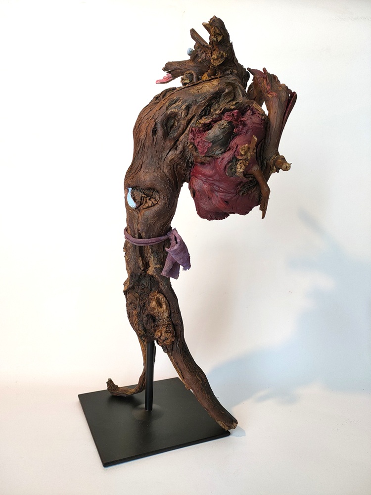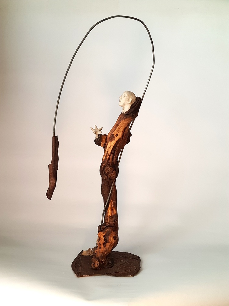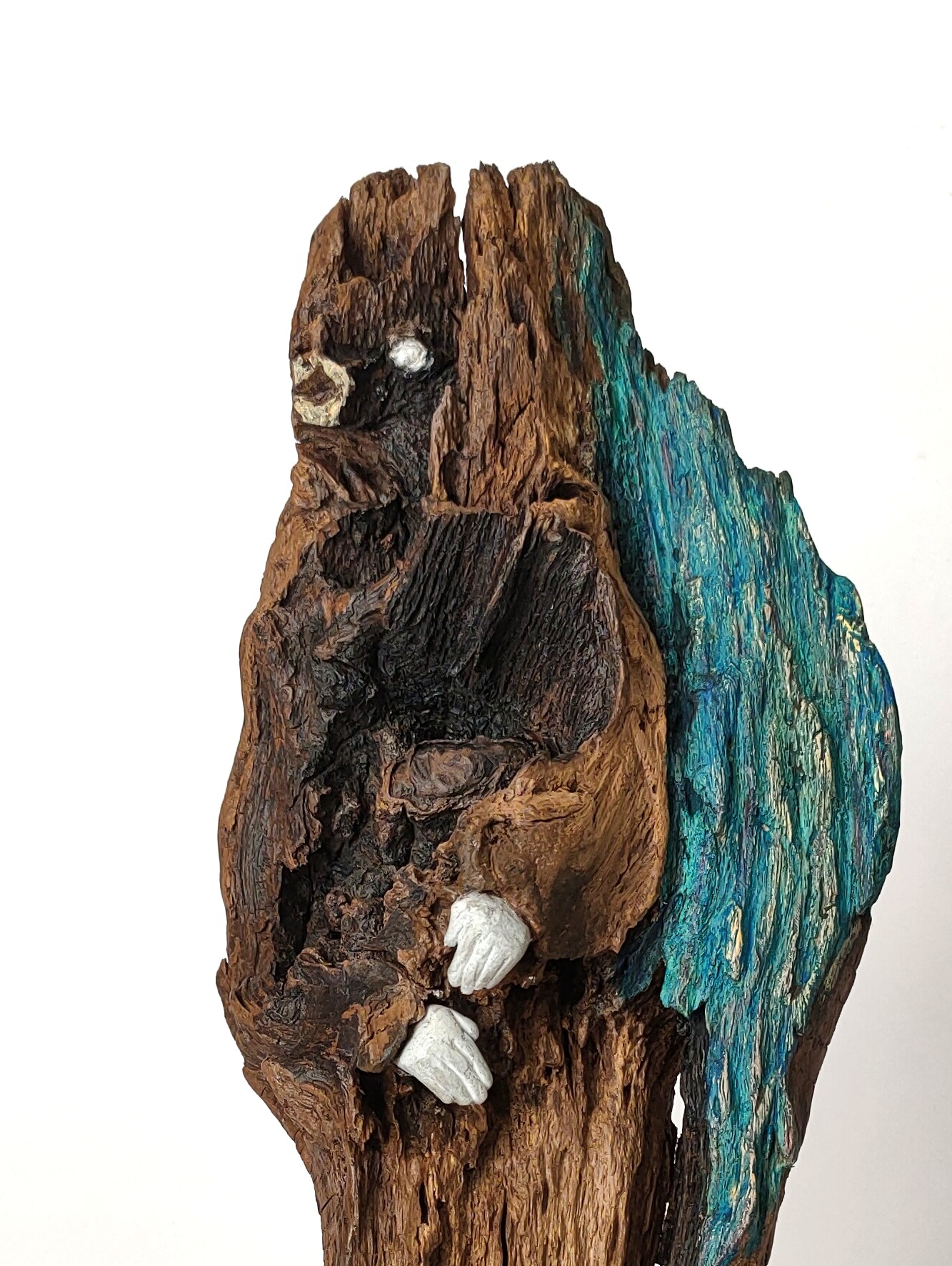 Bois flotté, métal, pâte à réparer, acrylique, vernis, socle fil de fer.