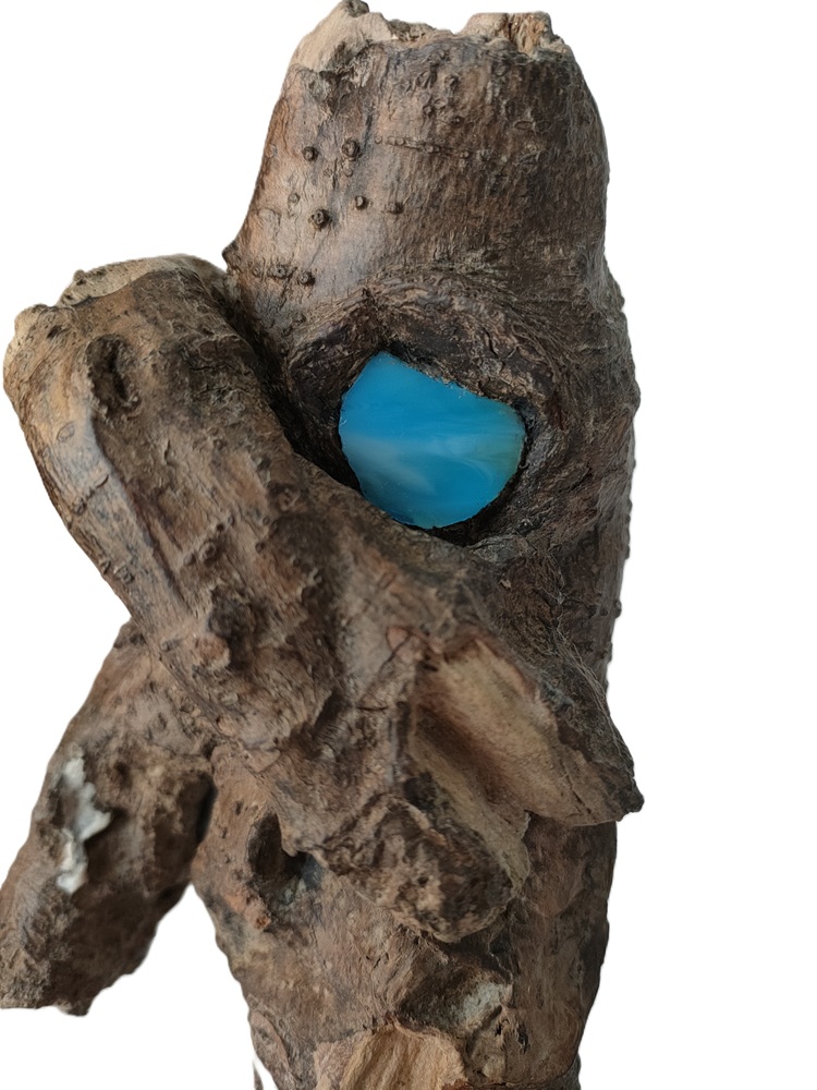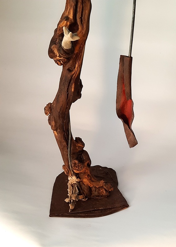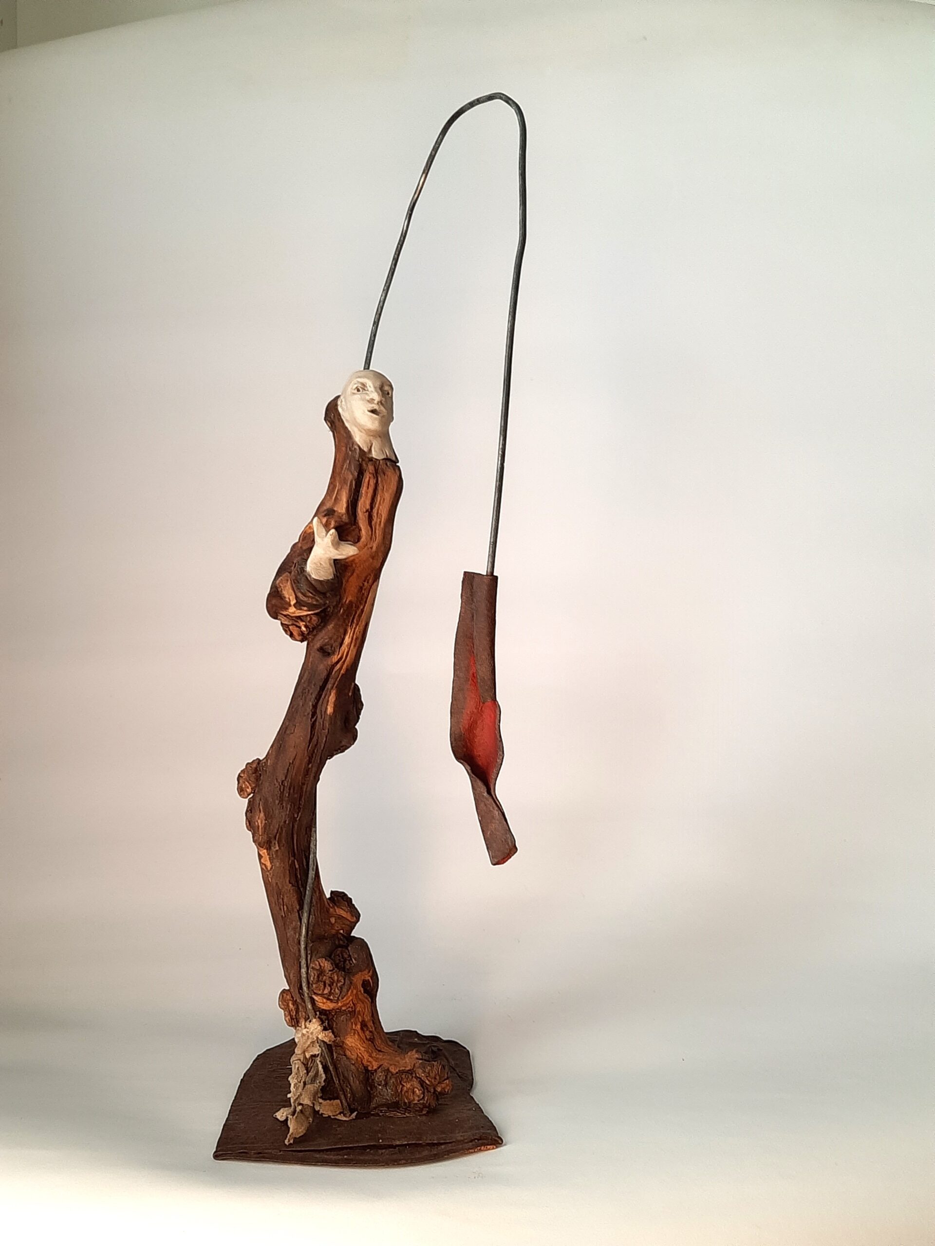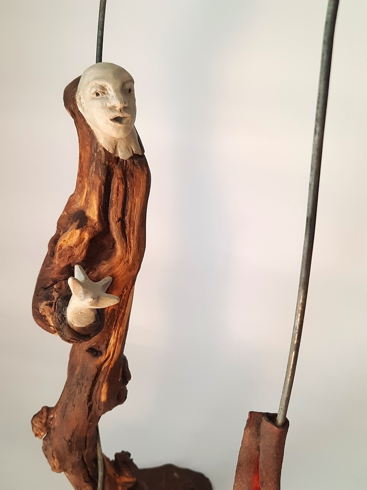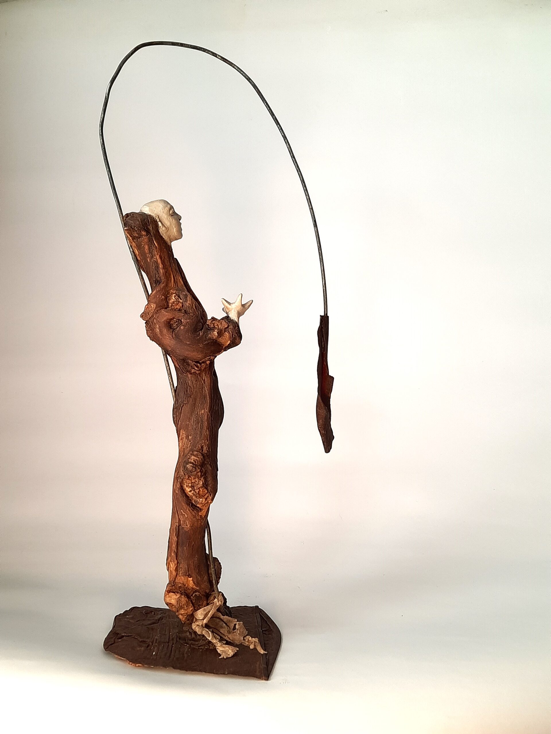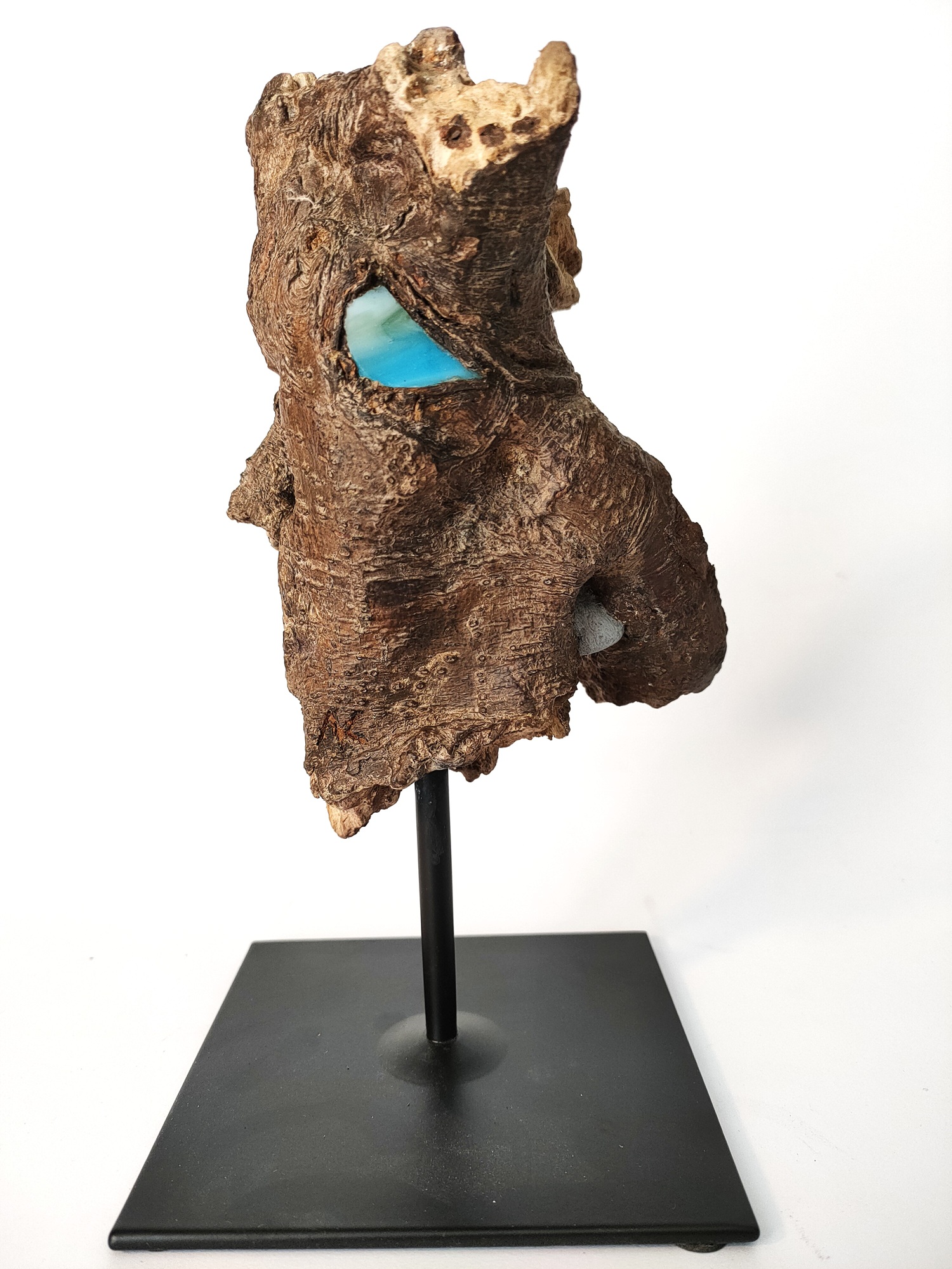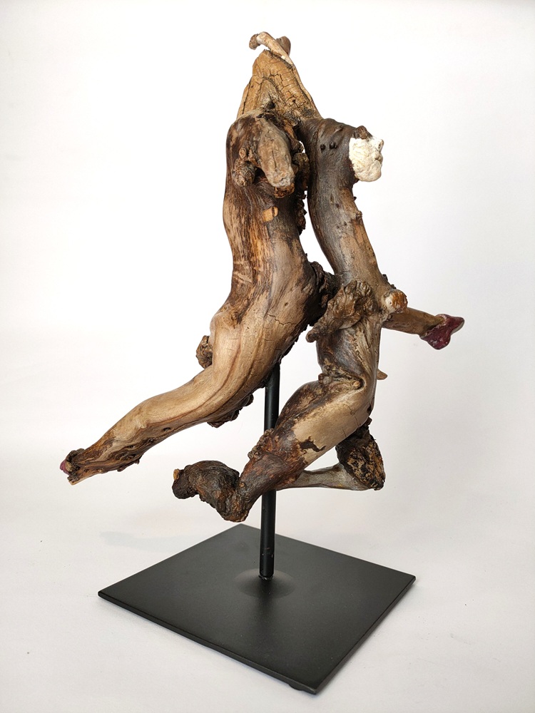 Bois flotté, métal, pâte à réparer, acrylique, vernis, socle fil de fer.