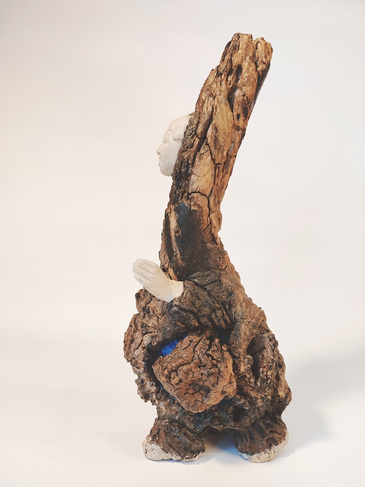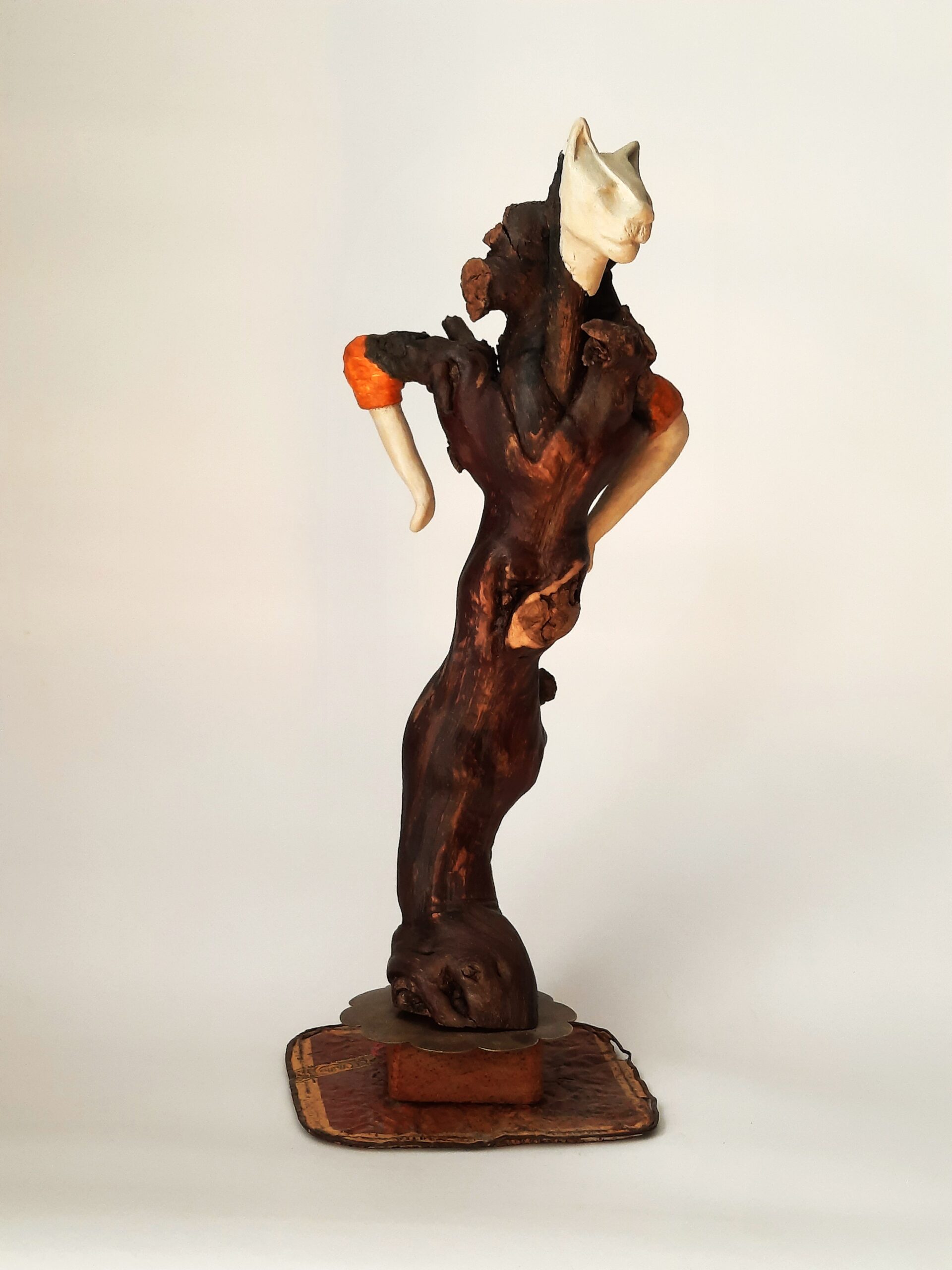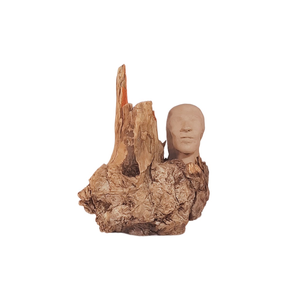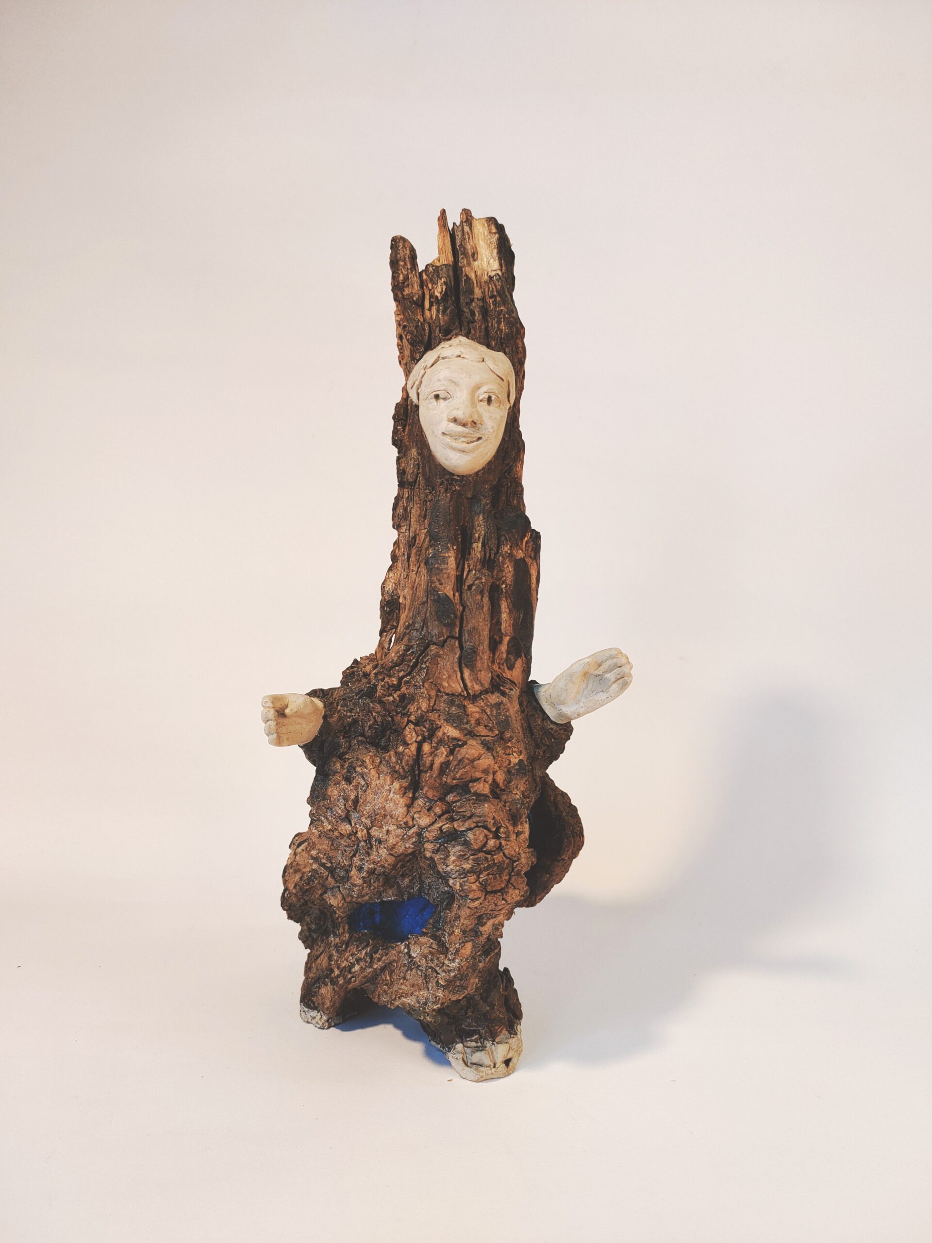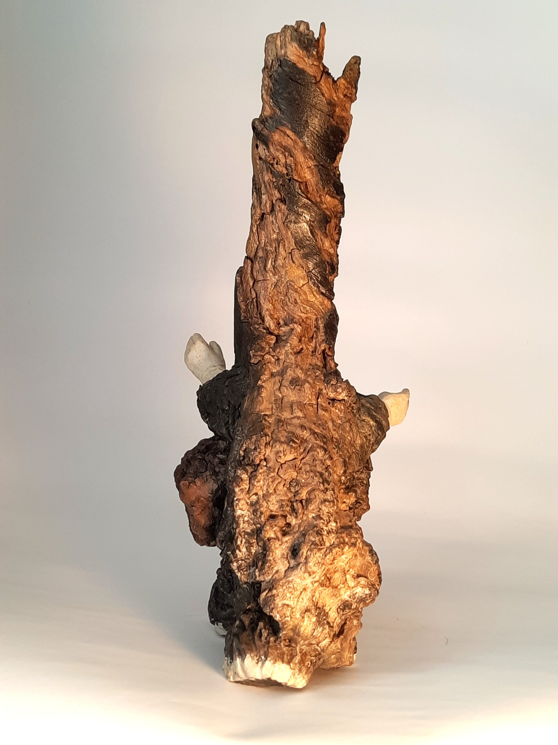 Sculpture mixte : Bois, terre, chaux, verre, fibres végétales, métal, vernis