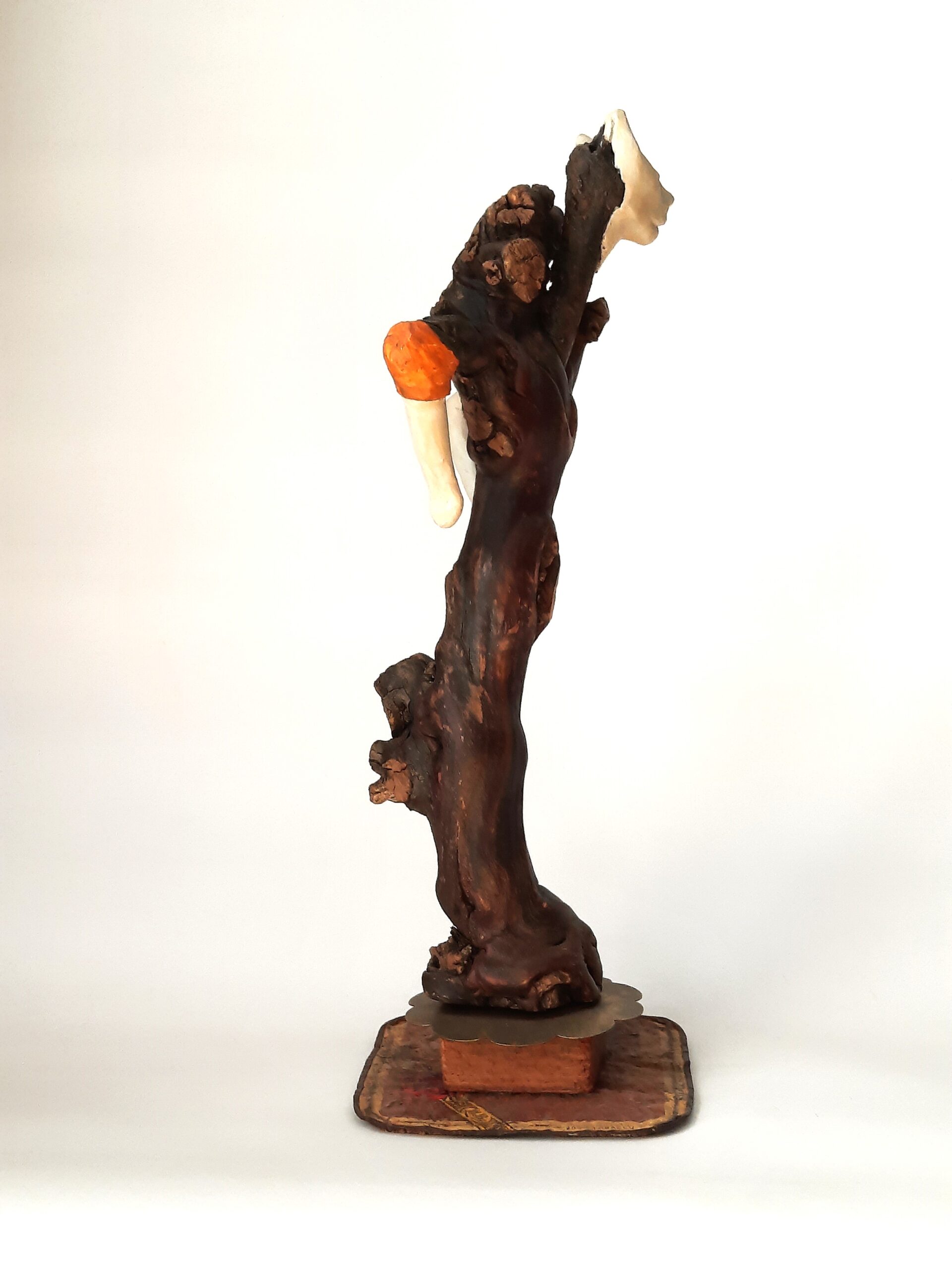 Sculpture mixte bois brut, terre noire fine cuite, acrylique, pâte à réparer, vernis, sur pied métallique peint mat.