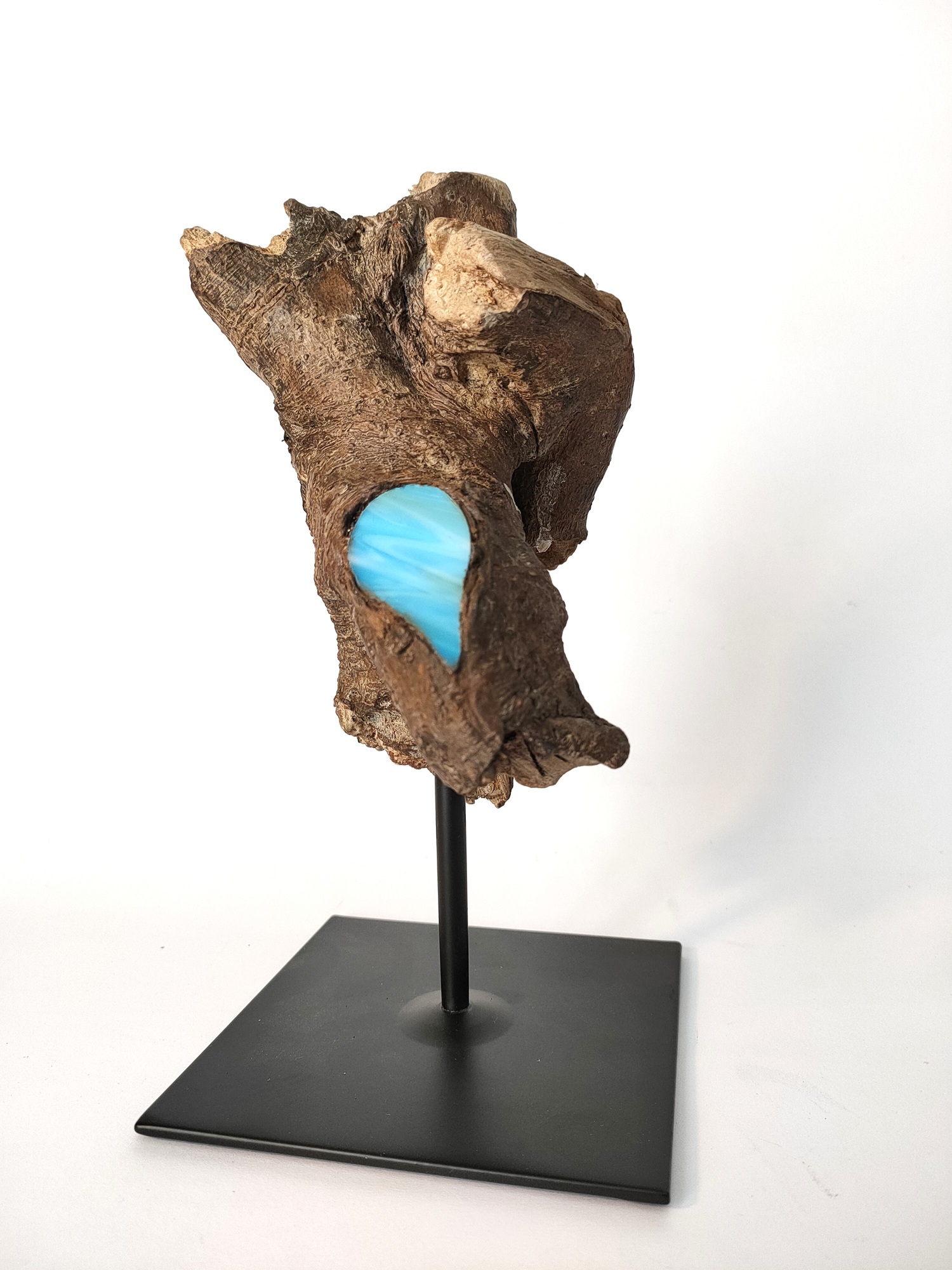 Bois flotté, verre, pâte à réparer, acrylique, vernis, sur pied métallique noir