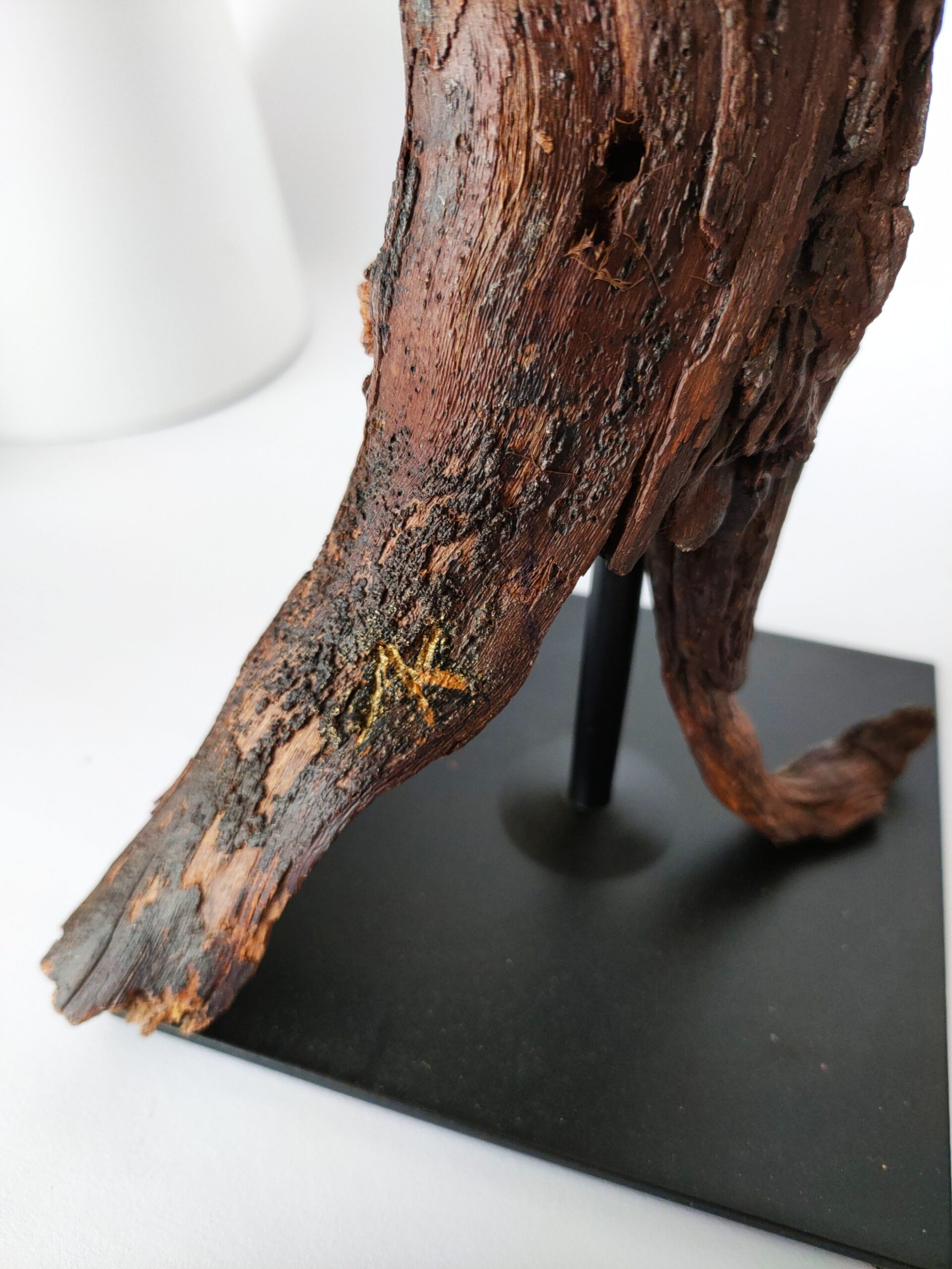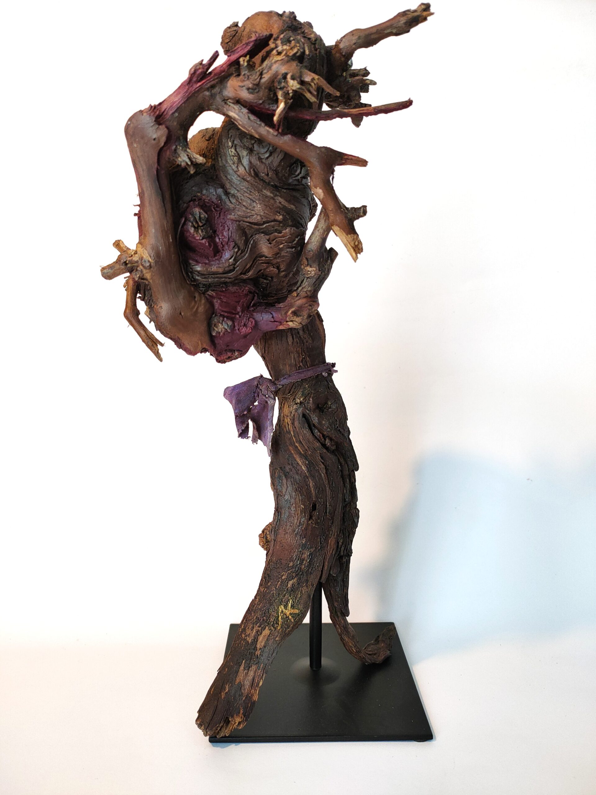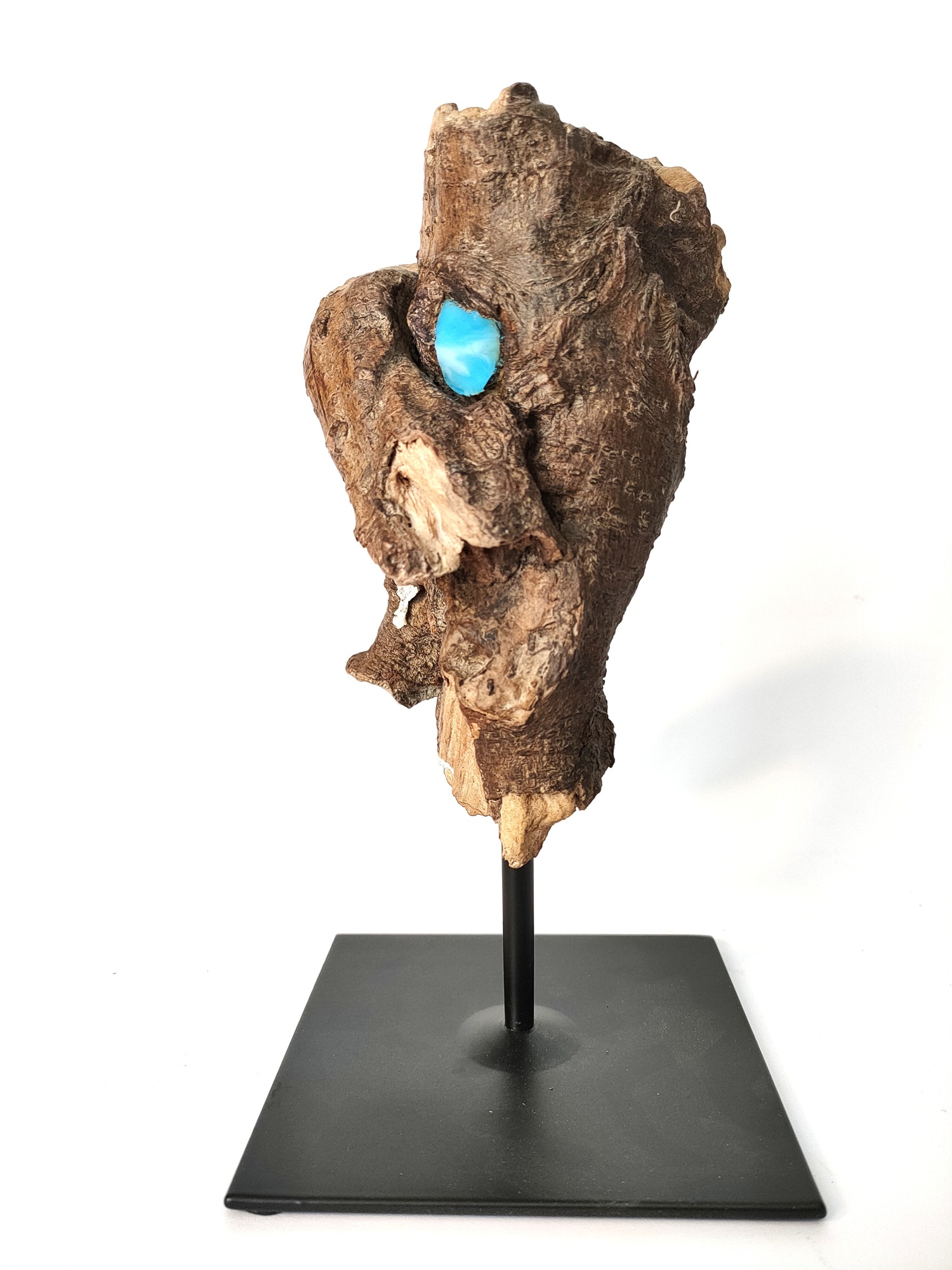 Sculpture mixte bois brut, terre noire fine cuite, acrylique, pâte à réparer, vernis, sur pied métallique noir mat.