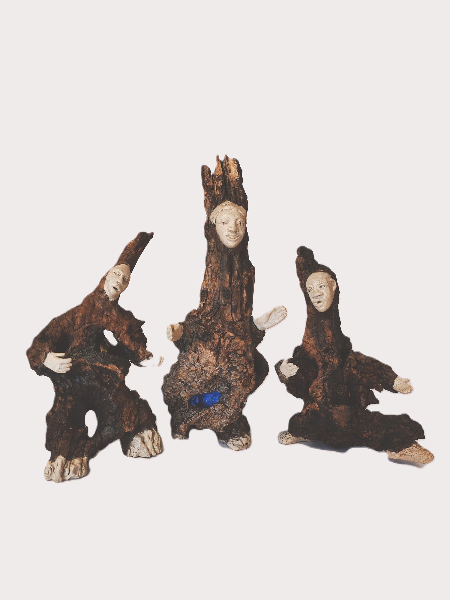En forêt les arbres déracinés offrent leurs coeurs tortueux et denses. 3 personnages issus d’une même récolte : le marcheur, la danseuse, le farceur.